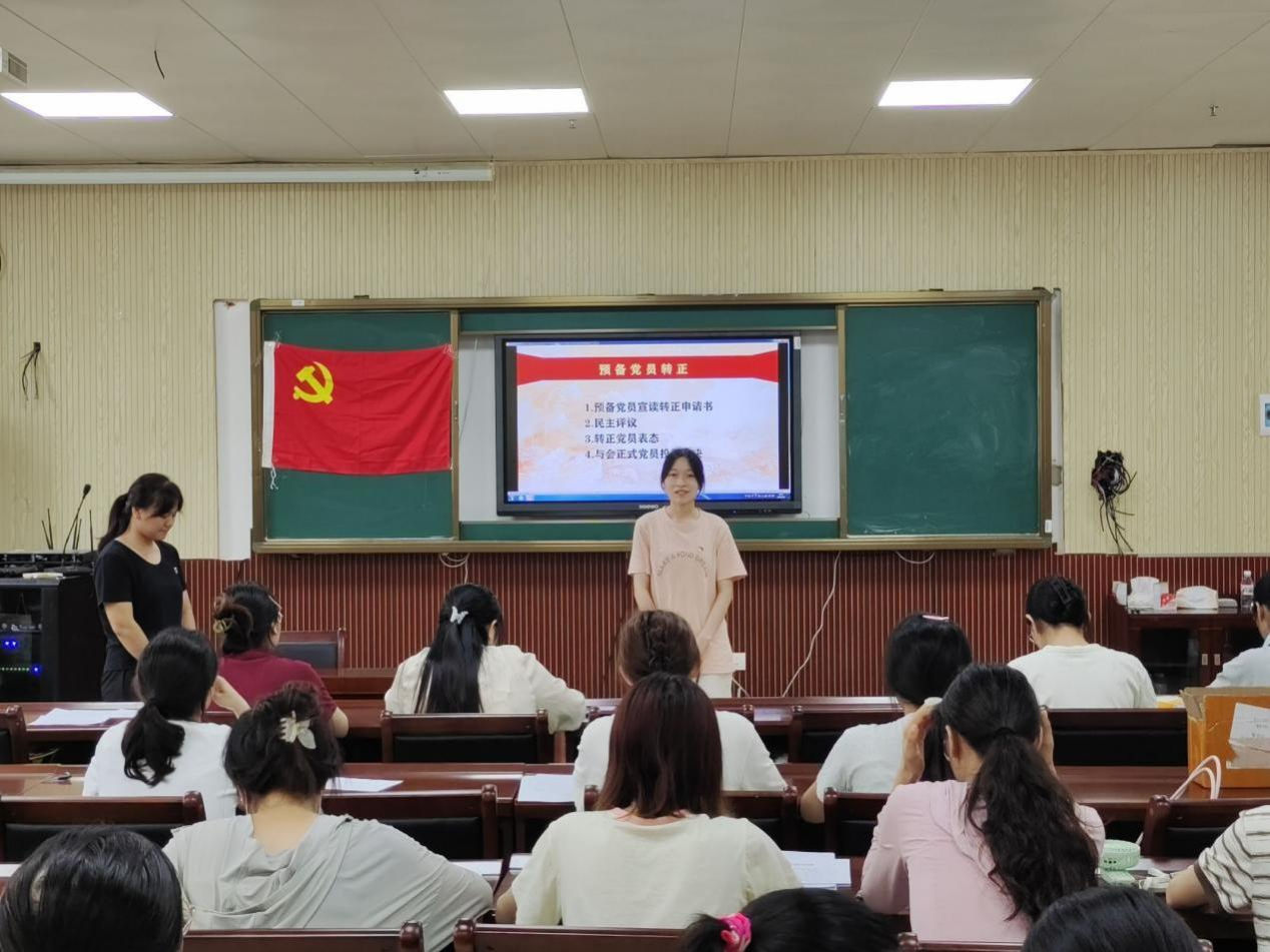会议伊始,支部书记李露露报告到会情况并宣读会议的流程,交代本次会议的各相关注意事项。接着,全体参会党员齐唱国歌。按照组织发展党员程序,唐榴媛等9名预备党员逐个宣读转正申请书,从思想、学习、生活、工作等方面向党支部认真汇报了自己预备期间的情况,表明自己的转正期愿。支部副书记蓝平乐代表支部委员会向大会报告了支委会的转正意见。随后,与会党员分别对转正预备党员进行民主评议,介绍讨论申请转正的预备党员在预备期间的考察情况。与会正式党员对以上同志是否按期转正进行无记名投票表决。最后,根据投票结果和支委会意见,支部同意唐榴媛等9名预备党员按期转正,报上级党委备案。