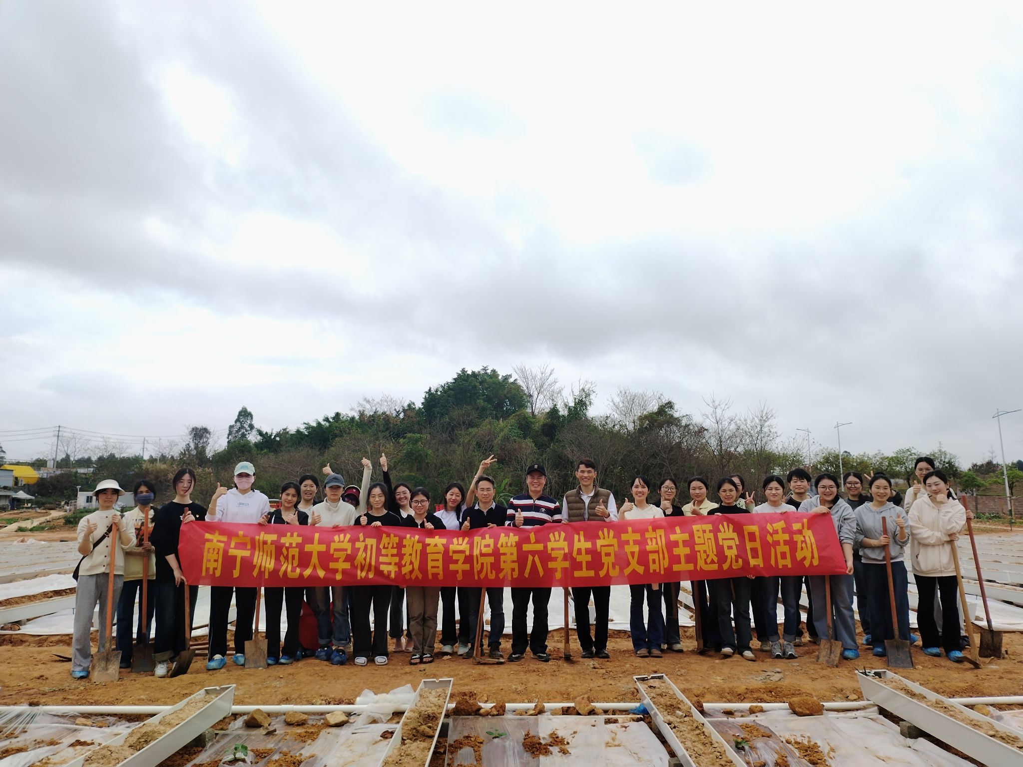 第六学生党支部在五合校区劳动教育基地开展“厚植红色根脉,耕耘绿色未来”主题党日活动,学院党委副书记苏学权、党委组织员何聪、辅导员韦文平、支部书记覃诗雅及支部全体党员参与。