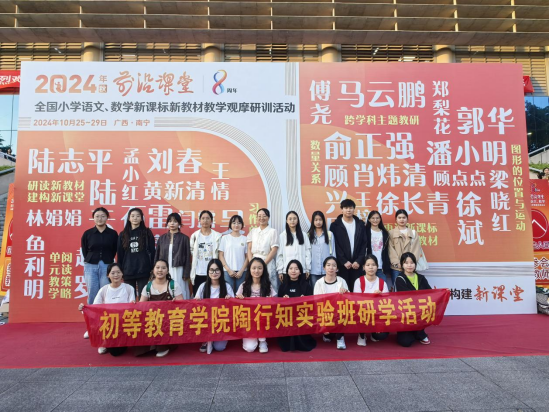 组织21-22级陶行知实验班学生和24级小学教育专业语文方向研究生在李美旋老师的带领下前往广西大学综合体育馆参加“‘前沿课堂’全国小学语文新课标新教材教学观摩研训活动”。