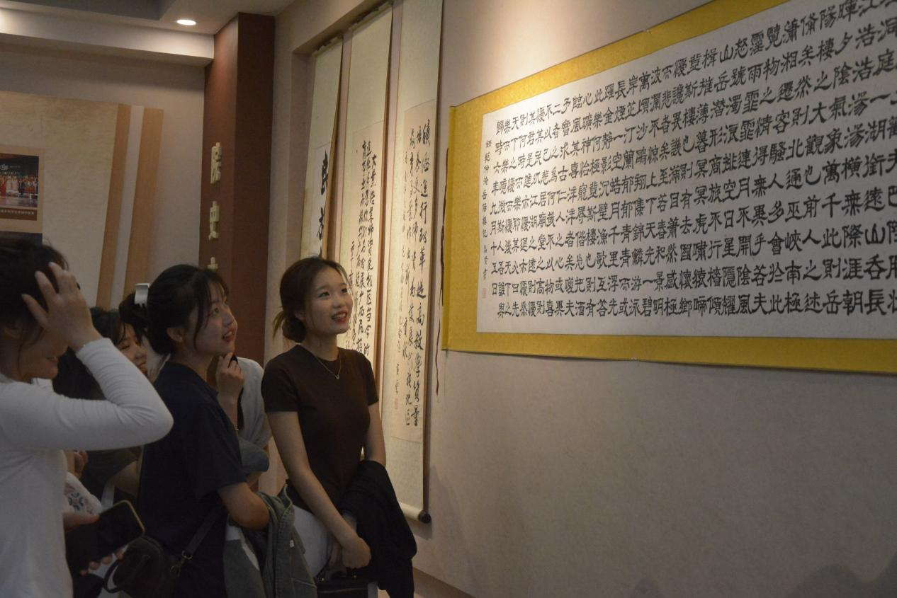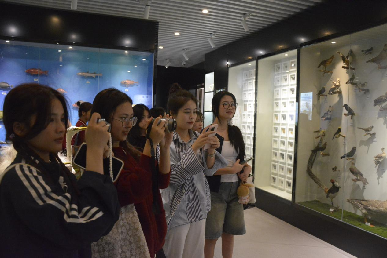 的发展历史与办学成就进行深入了解。接下来,参观生物标本室,陈列于馆中的精美标本,引发了留学生们的热烈讨论。紧接着,大家一同欣赏了师范生基本功训练“三笔一画”优秀作品,学院学生创作的书法、绘画等作品,让留学生们连连称赞。