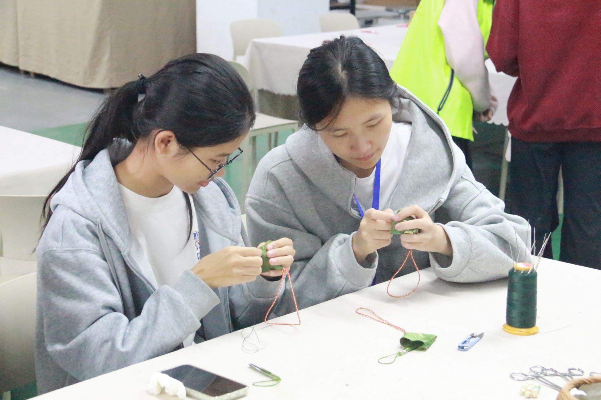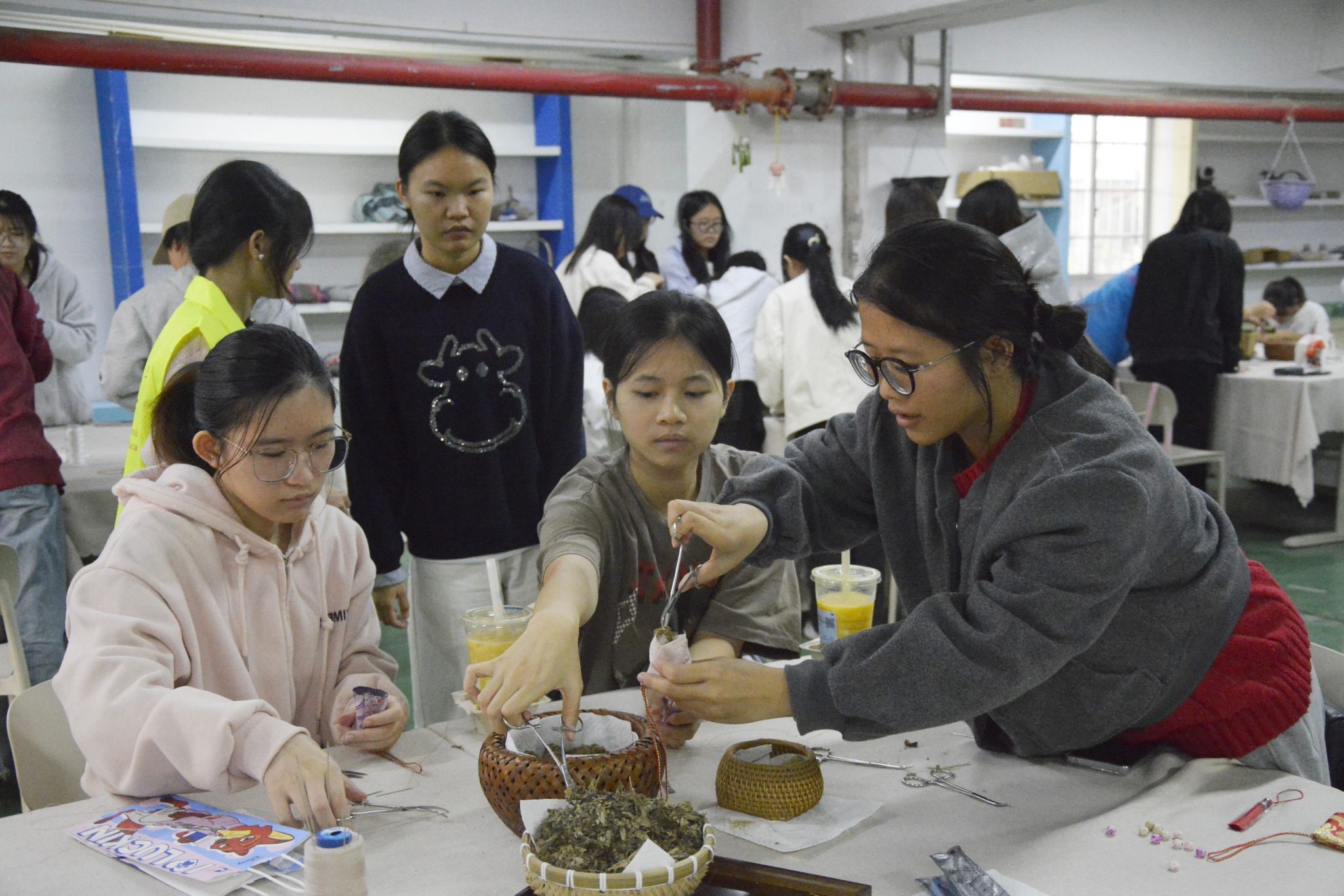 活动伊始,主持人展示香囊成品,讲解其驱邪避疫、祈福纳祥的民俗寓意,同时介绍艾草、艾绒温经散寒、祛湿止痛的养生功效,让学生初步感知香囊承载的文化与实用价值。随后,主持人结合实物演示,逐步讲解了香囊从裁布、穿针引线的基础步骤,到填充干花药材的搭配技巧,再到封口收线的收尾方法,并现场示范了基础刺绣针法的操作细节。活动以“沉浸式学习+亲手实践”为核心,现场为学生配备圆头针、彩线、预裁布片等物料,工作人员分组指导基础刺绣针法,协助解决缝制、香料搭配问题。完成制作后,学生手持专属香囊展示并带回留念。