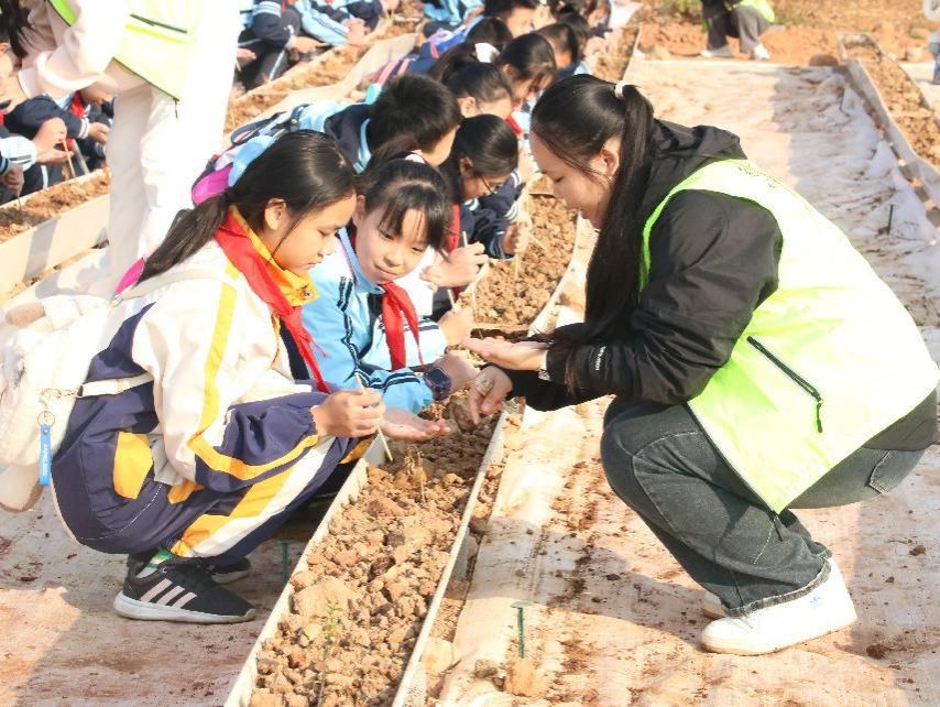 学工办辅导员和志愿者引导参与。其中,在五合劳动教育基地,大家参与了叶菜“点播”实践。经过志愿者们对叶菜种类、生长周期以及种植技巧的简单介绍,小学生们在指导下将叶菜种子播撒在种植槽,并细心做好松土、浇水等环节,亲身体验劳动独特魅力。在生物标本室和明德馆的参观中,随着讲解员的带领,师生们感受了生物的多样性,并深入了解了司机社