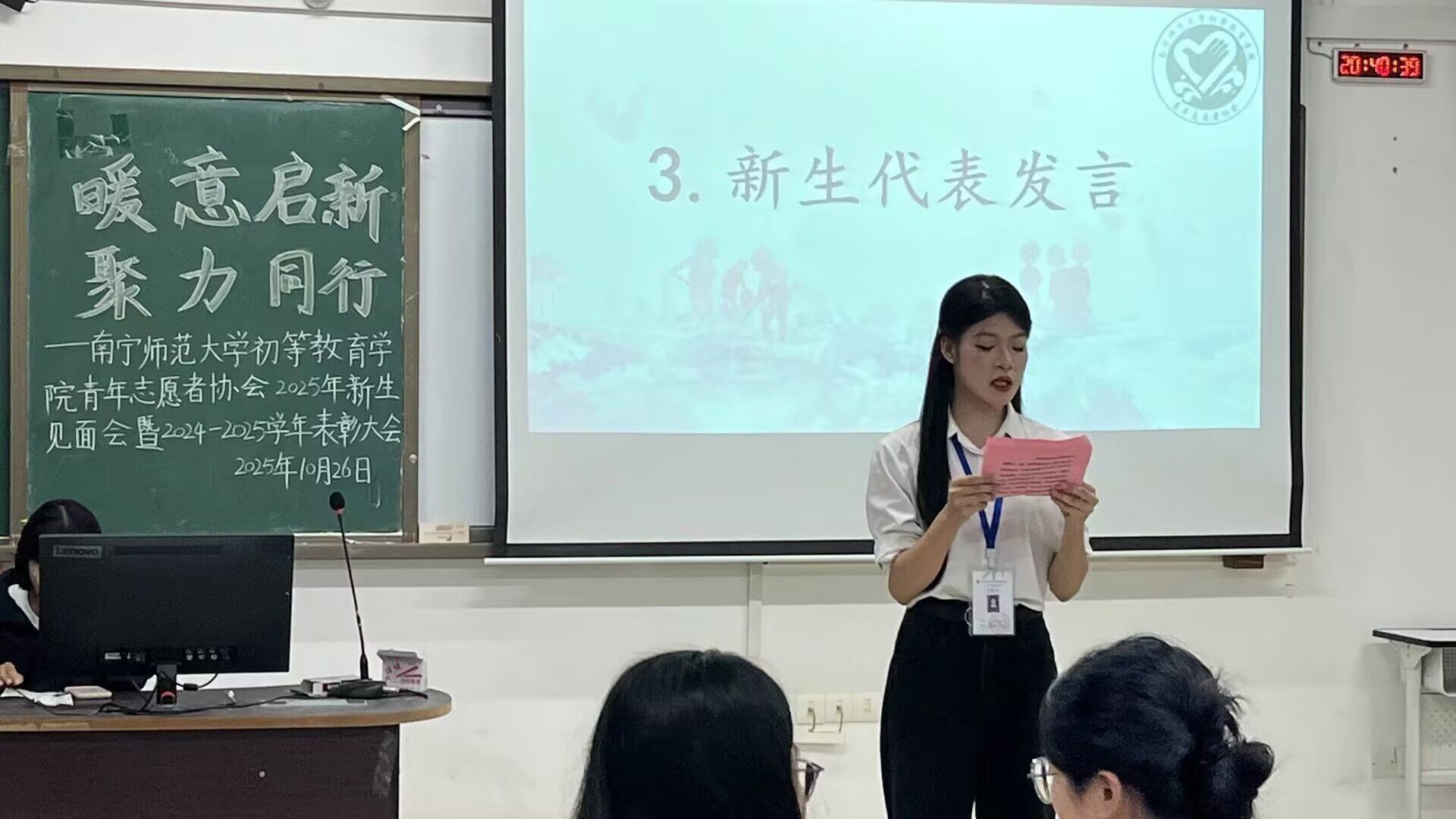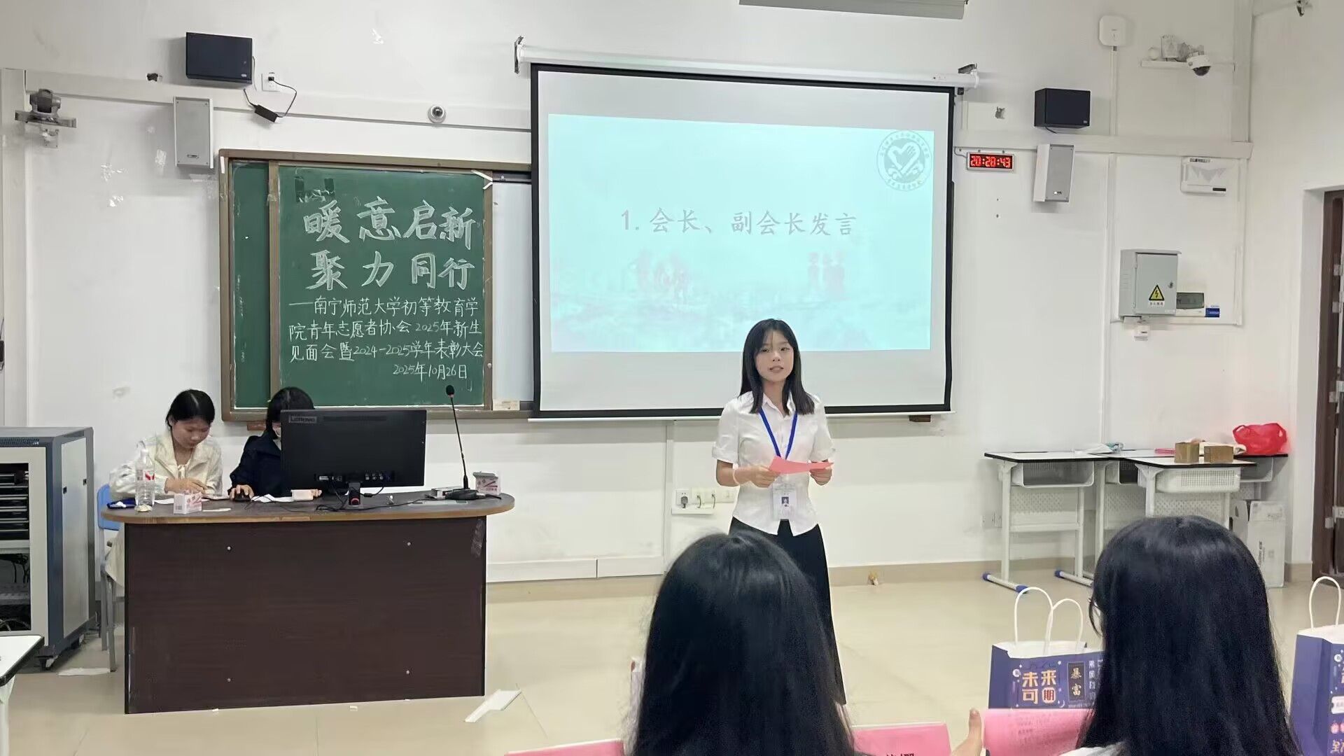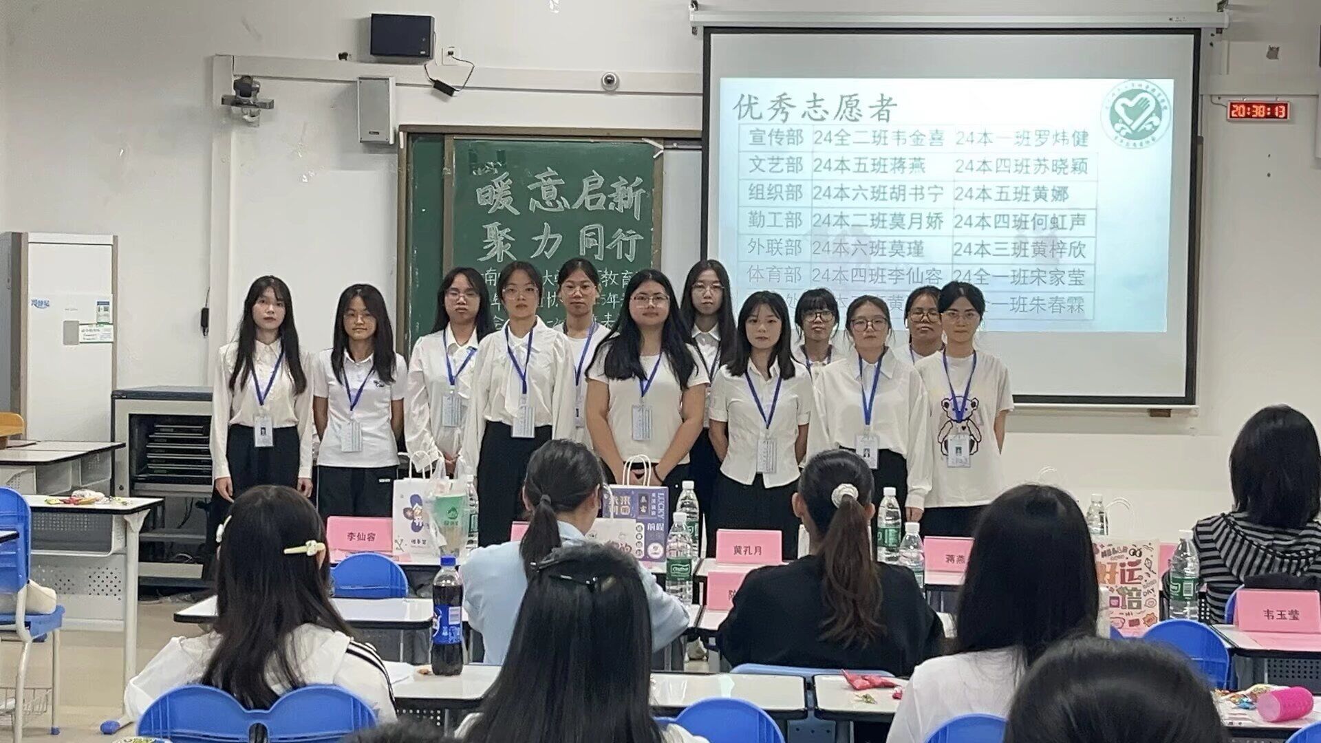 第六届青年志愿者协会优秀工作人员及优秀志愿者名单后,获奖人员有序上台,在镜头记录下合影留念,定格这份属于志愿服务的荣誉时刻,也为现场新生树立了优秀榜样。