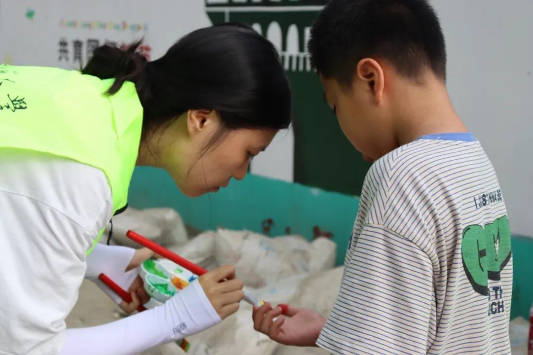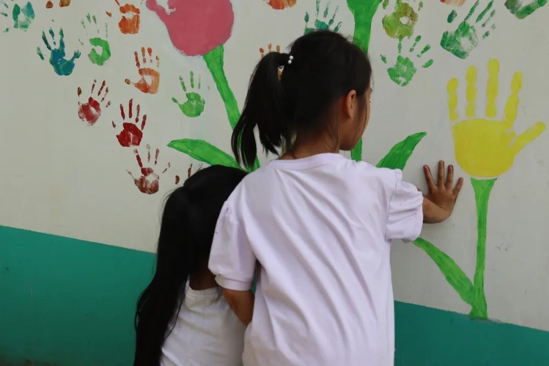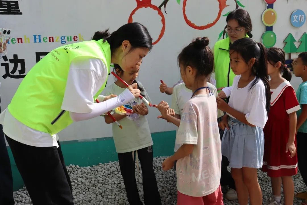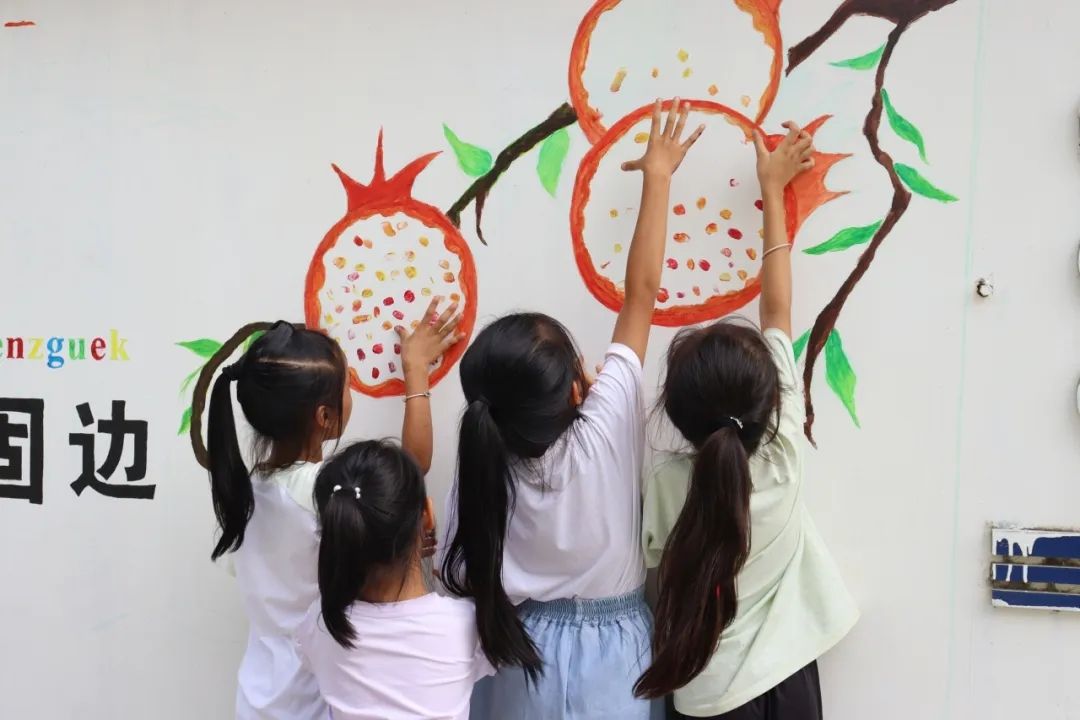 绘制过程中,实践队齐心协力、分工负责,完成了墙面的清洁与白漆打底工作,队员们手握画笔与刷子调色、勾勒、上色,并邀请柳班小学的小朋友共同绘制,将原本单调的墙面装扮的色彩斑斓、图文并茂。 此次墙绘活动不仅让“旧”墙焕发了新生,更在孩子们心中种下了美的种子,加深了他们对家乡与学校的热爱以及对讲好普通话的热情,成为了传承文化、稳边兴边、关爱儿童成长的生动实践。
