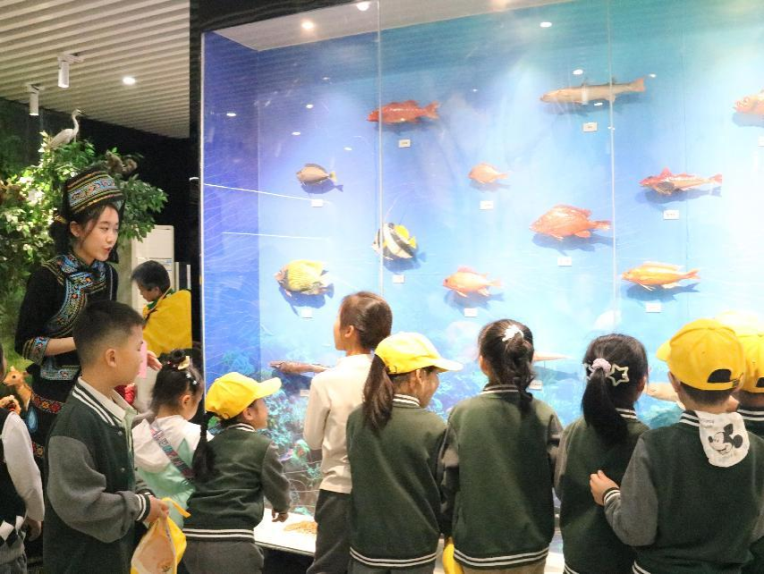 活动伊始,同学们戴着班级小黄帽有序集合,学生和家长分成两组交叉参观了理综明德馆和生物标本室,在学生志愿者的讲解中了解司机社