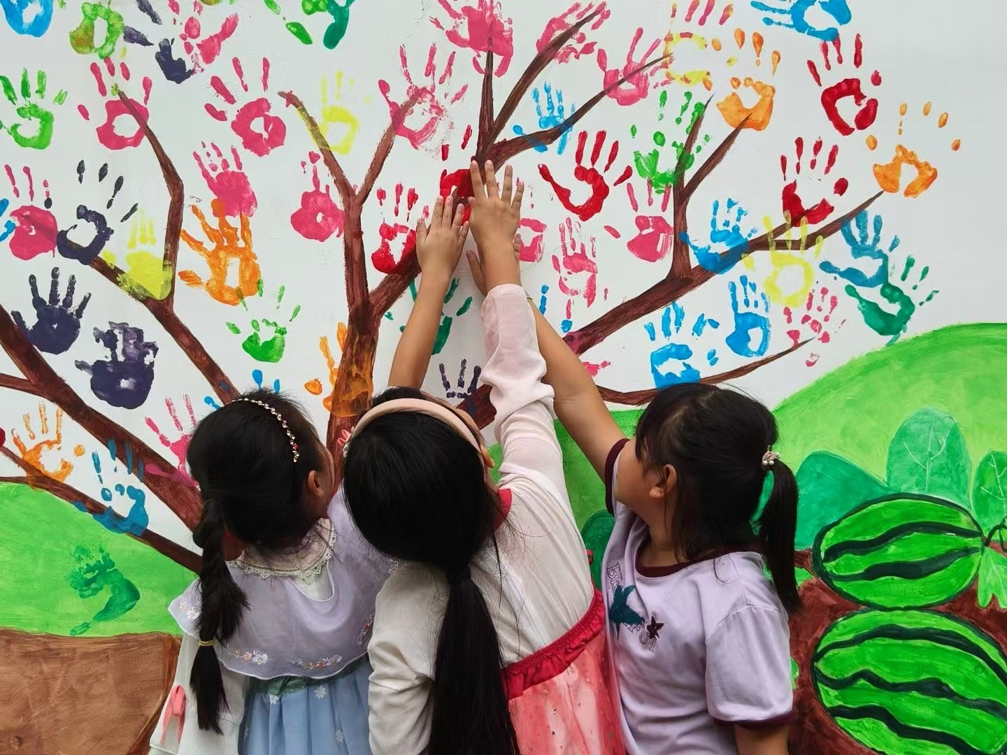 实践团队与学校师生共同讨论,设计了一幅寓意深刻的劳动教育墙绘。实践队员们在墙上勾勒出精美图案,并注入鲜亮色彩,让整个墙绘鲜活起来。墙绘中央是一棵茁壮成长的大树,象征着劳动教育的丰硕成果。实践队员带领小朋友们在树干上用彩色颜料按下自己的手印,寓意着“劳动之手”托起美好未来。大树四周环绕着小朋友们学习劳动技能、体验农耕劳作等生动场景,色彩明快,充满童趣。小朋友们纷纷表示,这是自己第一次参与墙绘创作,看到自己的手印变成大树的一部分,感觉特别有意义。