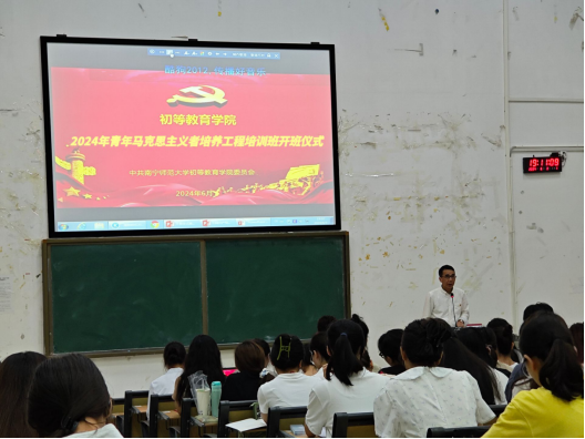 2024年“青年马克思主义者培养工程”培训班在五合校区五综308教室举行开班仪式暨开班第一讲。学院党委书记陆以宏出席仪式并作第一讲专题培训。仪式由学院党委组织员何聪主持,学院辅导员与2024年“青马班”学员参加了仪式与培训。