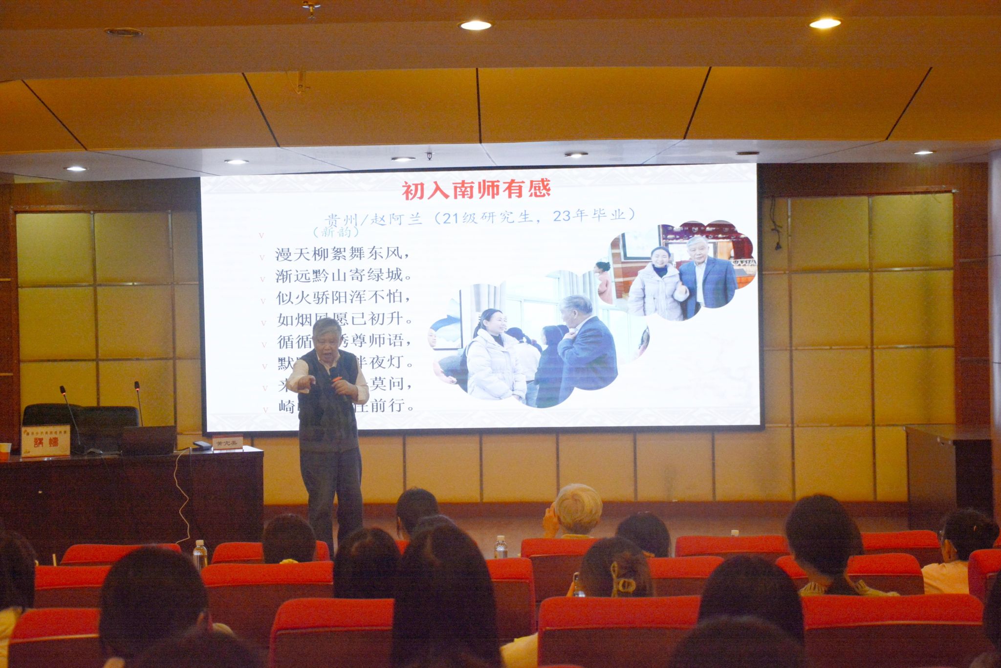 此次报告中,黄亢美研究员以《未来小学教师的汉字文化素养》为主题,就汉字文化与教学实践展开深度分享。他首先阐述了诗律、字理等基础概念,随后围绕诗联声律的教学逻辑,结合《枫桥夜泊》等经典诗词解析格律诗平仄规律,同时通过学生创作案例,阐释“诗联声律知识在教学中的运用”,并示范了“依据平仄或节奏梳理词序”的实用教学方法。整场报告由理论到实践,内容翔实,不仅深化了在场师范生对汉字文化的理解,更为他们未来的教学实践提供了宝贵借鉴。